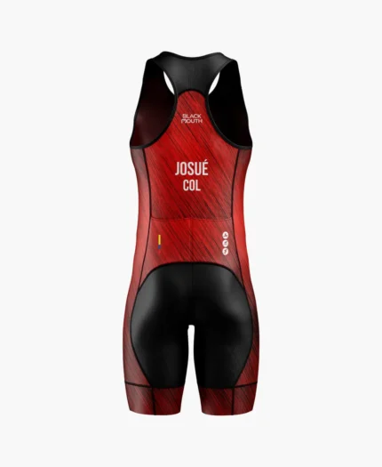 El trisuit de triatlón presenta un diseño rojo y negro con estética agresiva que transmite potencia y rendimiento, ideal como trisuit de triatlón competitivo. Este trisuit es un traje de triatlón trifunción para natación, ciclismo y running, desarrollado como uniforme de triatlón técnico para alto desempeño.